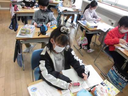 理科の学習で、豆電球と電池をつなげて明かりがつくかどうか調べました。様々なつなぎ方を調べ、どんなときに明かりがついたり、つかなかったりするのかについて考えました。