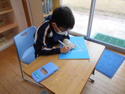 図工の学習で、自分の似顔絵を描き、版画作品を制作中です。彫刻刀に初挑戦しました。最初は、おそるおそる彫っていましたが、だんだんと自分の思うような線を彫ることができるようになりました。