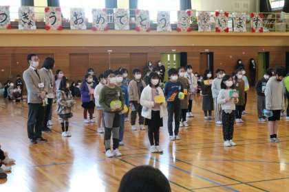 3年生は、写真立てを送りました。片側には学校の写真、もう片方には各自で選んだ絵を手書きしました。一人ずつ並んで、祝う会で直接手渡しました。喜んでもらえてよかったです。