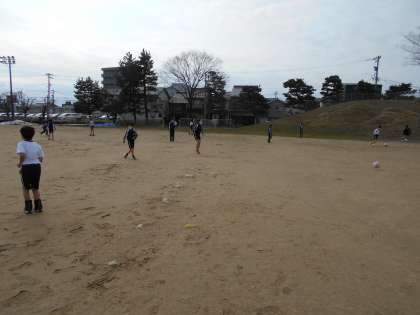 暖かくなり、久し振りにグラウンドで体育を行いました。団の友達とパスをたくさんつなぐ練習をしました。