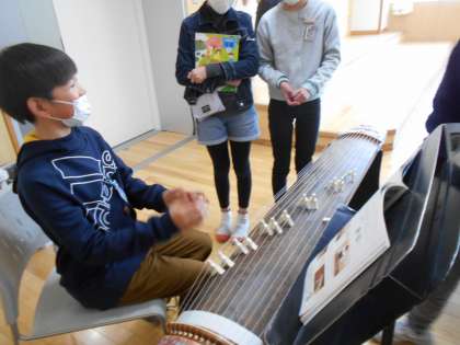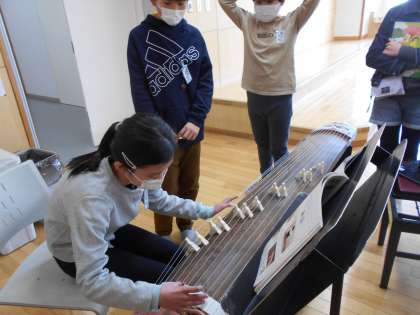 子供たちは、音楽の学習で箏を弾いています。見慣れない楽器に子供たちは興味津々で触っていました。楽譜を見ると一見難しそうに見えるのですが、弾き方が分かると「案外簡単かも」「さくら弾けた!」と楽しそうに弾いていました。