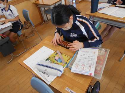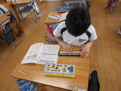 算数の学習でそろばんに挑戦しました。数の表し方、入れ方、取り方を学び、たし算とひき算に取り組みました。「計算がしやすい!」とそろばんのよさを感じている子供がいました。