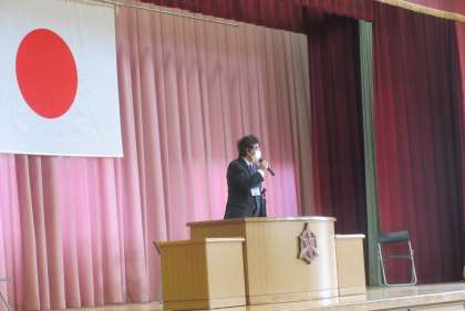 次に始業式です。校長先生の話をうなずきながら聞くとうぶっ子です。