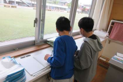 朝から1年生の手伝いをしている6年生の姿が見られました。進んで手伝いをする様子から、最高学年として頑張ろうという前向きな気持ちが伝わってきます。