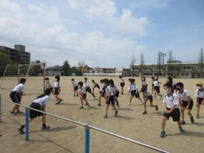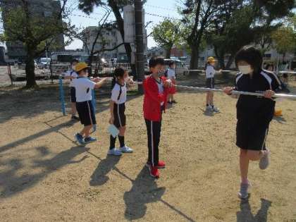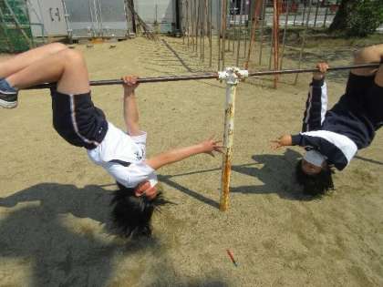 体育で鉄棒運動をしています。ペアで技を確かめ合ったり、教え合ったりしていました。