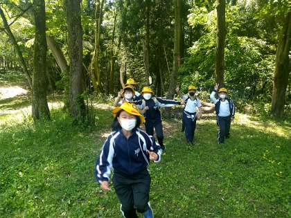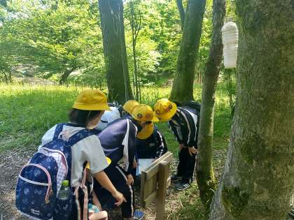 最初の活動がスタートしました!子供たちは豊かな自然を味わいながら、班で協力して、ポイントを探したり、クイズを解いたりしています。