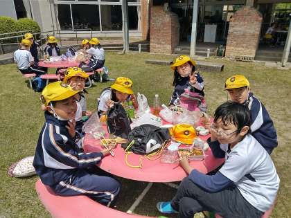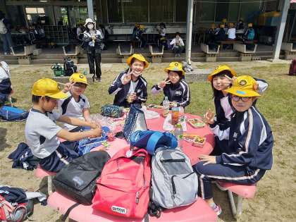オリエンテーリングを終え、お弁当タイムです。たくさん歩き、少し疲れた様子はありましたが、みんな笑顔でお弁当を食べています。