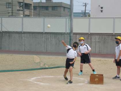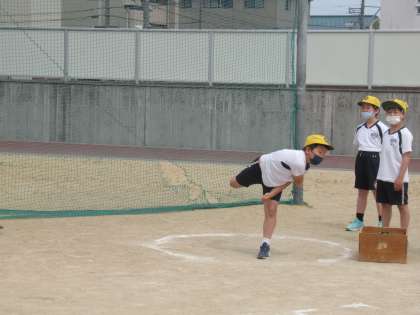 体育では、ソフトボール投げに取り組んでいます。ボールの投げ方を工夫し、去年よりよい記録が出るようにがんばって練習しています。