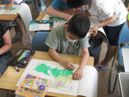 社会科では、富山市の様子について学習しています。今日は地図帳に色を塗り、土地の利用について考えました。