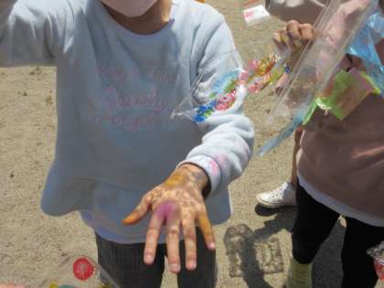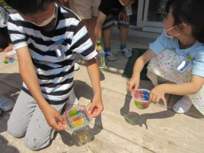 図工の時間に、「ひかりのプレゼント」を学習しました。作品を太陽の光にあてながら、「光にあてると、色が明るく見える」「友達のものと重ねてみると、色が変わって見える」「地面の近くで見ると、地面に色がうつっている」など、様々な発見をしていました。