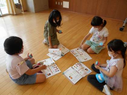 音楽では、歌を歌うだけでなく、拍に合わせてカスタネットを打つ練習をしています。みんなで声と音を合わせ、楽しみながら練習しています。