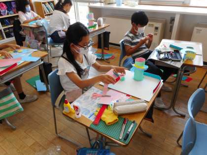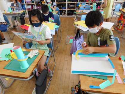 図工の学習で、立体作品を製作中です。段ボールや画用紙でビー玉を転がすコースを作っています。より楽しいコースになるように自分で試してみたり、友達と一緒に遊んだりと、とても楽しそうです。