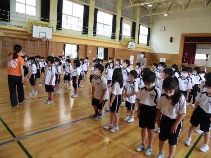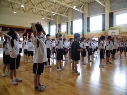 体育では、グループに分かれて折り返しリレーをしています。力いっぱい走ることができるように準備体操をしっかりと行います。腕を伸ばしたり首を回したり、十分に体をほぐしてからリレーを行いました。