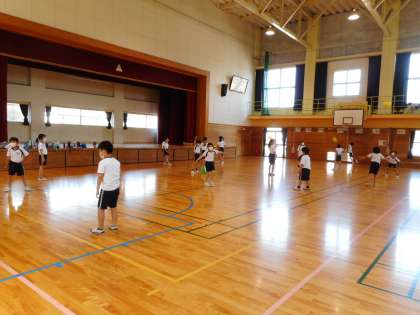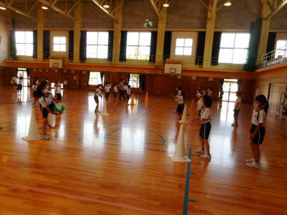 体育の学習で、キャッチバレーボールの練習を始めました。チームでパスが続く作戦を考えたり、アタックの練習をしたりしています。