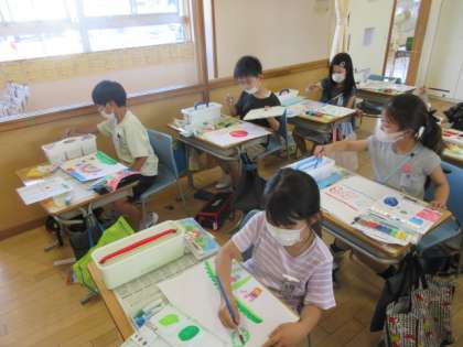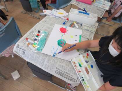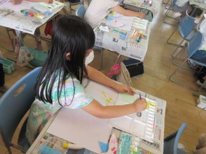 図工の時間に「ふしぎなたまご」をつくりました。たまごから「虹が生まれたらいいな」「たくさんの星が飛び出してきたらおもしろいな」など、生まれてくるものを想像しながら、楽しく活動しました。