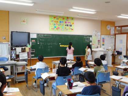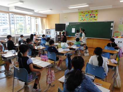 算数の学習で、子供たちで司会をしながら授業を進める「なかま学習」に挑戦しました。わり算の筆算の仕方をみんなで確かめたり、分からないところを話し合ったりしています。