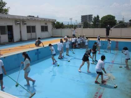昨日は5年生がプールの周りをきれいにしました。今日はいよいよプールの中をきれいにします。6年生が秋・冬・春にたまった汚れを一生懸命に落としました。