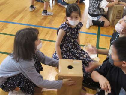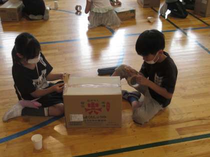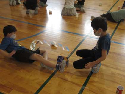 今日は講師の早川先生に、遊びの授業をしていただきました。早川先生からいろいろな遊び道具や遊び方を教えてもらいました。後半はペアを組み、段ボールで空気砲をつくって遊びました。