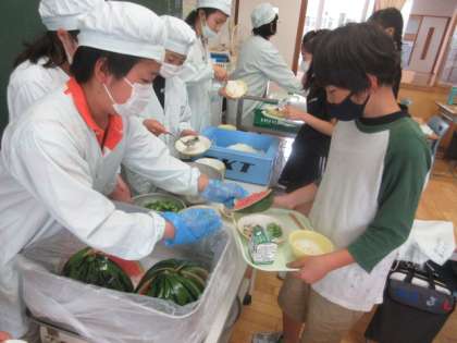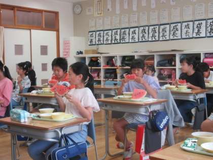 給食に、スイカが出ました。大きなスイカを見て、子供たちは大喜び。とても美味しそうに頬張っていました。