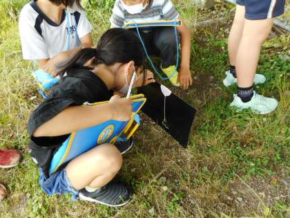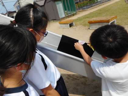 算数の学習では、角度を分度器で測ったり、角度が指定された三角形を描いたりしています。その学習を生かし、学校の傾いているところの角度を調べました。東部っ子山の傾きなど、生活の中での角度は思ったより小さいことに気付いていました。