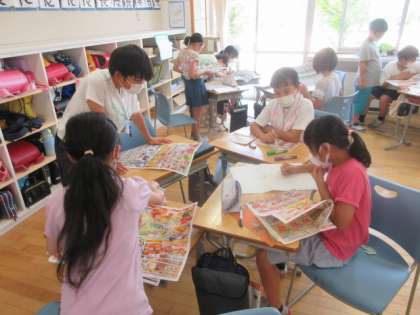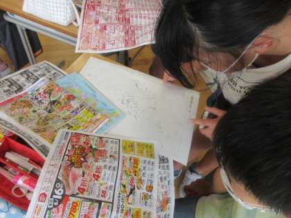 社会科の授業で、私たちが普段食べている食料はどこから来ているのか、スーパーのちらしを見て産地調べをしました。「富山県の食材がたくさんある」「中部地方から多くの農作物が来ているね」「果物は外国産のものが多いよ」などと気付いたことを話し合っていました。