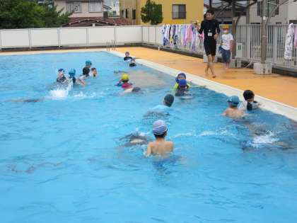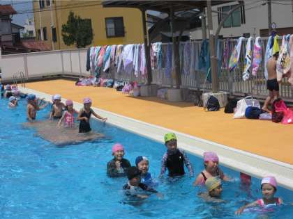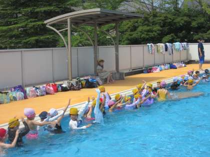 プール開きの式の後、1〜3年が早速プールに入りました。気持ちのよい水しぶきに子供たちは歓声を上げていました。