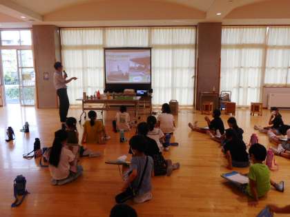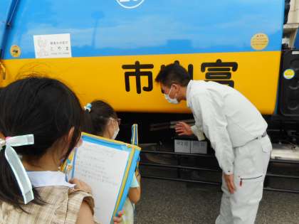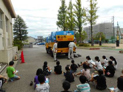 3R推進スクールがありました。ごみの問題や地球温暖化を防ぐために、3Rが大切だというお話を聞きました。また、近くでゴミ収集車を見て、消火器等の道具が備え付けられている理由や、ごみ捨て場の数など気になったことを積極的に質問していました。