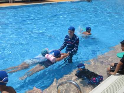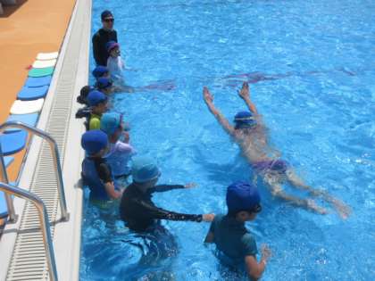 天気は快晴。プール日和。アピアスポーツクラブの水泳コーチの方に来て頂き、泳ぎ方を教えてもらいました。「いいよ。上手!」「できてるよ!」たくさんほめてもらって、楽しい水泳教室になりました。