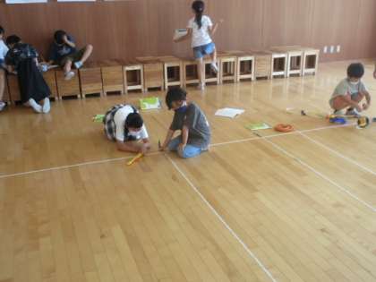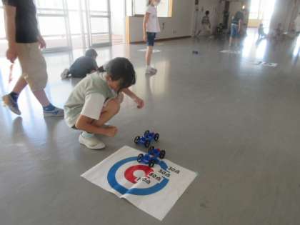 子供たちはぴったりに車が止まるよう、何度も試しながら、100点目指して実験を繰り返していました。