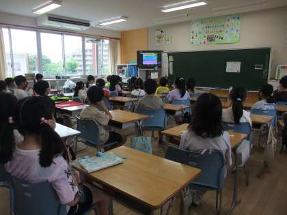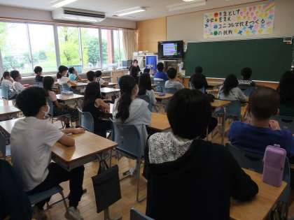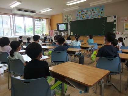 感染症予防のため、各教室でのオンライン形式で終業式を行いました。姿は見えなくても目と心をつないで、校長先生の話を集中して聞く東部っ子です。