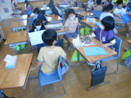 国語科の「ききたいな、ともだちのはなし」の学習で、自由研究の発表をしました。友達の作品に興味をもって質問したり、自分の作品についてがんばったところなどを話したりしました。