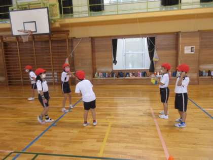 体育で「ドッジボール」の学習を行いました。団の友達と作戦ボードで作戦を立てたり、作戦が成功するための練習を考えたりしていました。