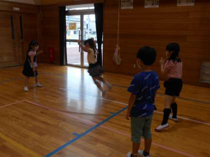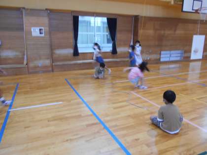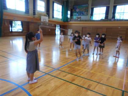 朝の支度が終わった人から、「パワーアップTOBU」に取り組んでいます。2学期からは、一週間に一回、体育館を使って活動することになりました。1年生は各クラスに分かれて、長縄跳びに挑戦します。様々な技ができるように、みんなで楽しみながら活動していきます。