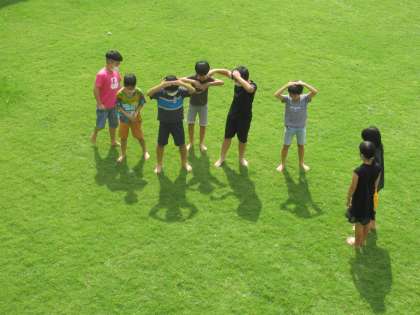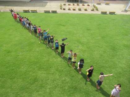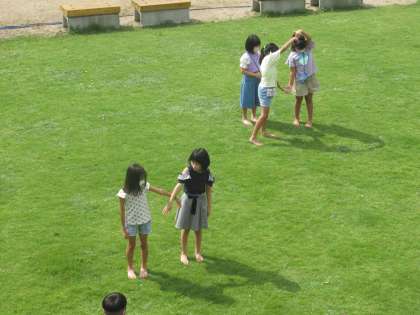 理科では、太陽と影の関係を学習しています。天候に恵まれ、みんなで芝生広場に出て影の様子を観察しました。みんなの影が一直線につながったことから、影は同じ方向に伸びていることが分かりました。