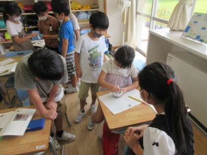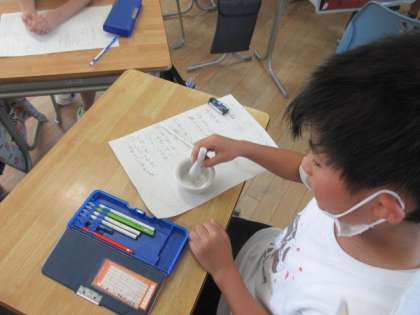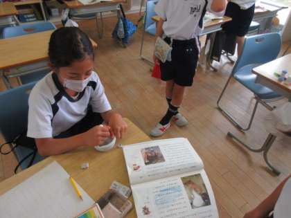 今日は、国語科「どうぶつえんのじゅうい」で、ニホンザルの場面を学習しました。お猿さんに薬を飲ませるために、薬をすりつぶして与えるという工夫を文章から読み取りました。そこで、グループの友達と、薬をすりつぶす体験をしました。子供たちは、「獣医さんは、大変なんだなあ」と、感想を話していました。