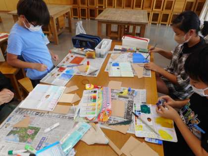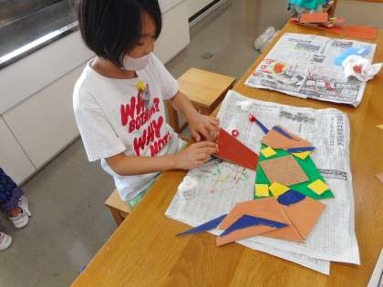 のこぎりを上手に使えるようになった子供たちは、切った板を組み合わせて、どんな作品にしようか考えました。きれいな色を塗って、すてきな作品ができあがってきています。
