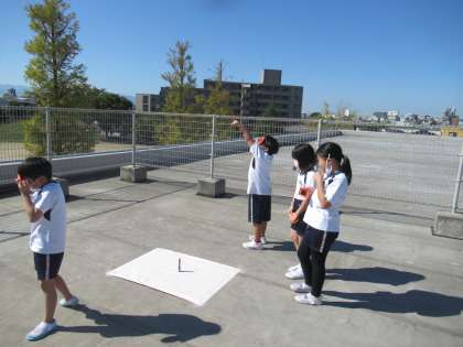 2組は今日、屋上を使って、太陽の位置とかげの位置の関係を観察しました。太陽が東から西へ動くのに対し、かげは西から東へ動くことが分かりました。更に、かげは観察する時間によって大きさが変わりました。子供たちは太陽とかげの関係について、関心を高めていました。