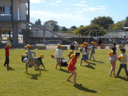 1年生は、国語で「くじらぐも」の学習をしています。国語の学習の後、コミュニケーションタイムに「天までとどけ、一、二、三。」を芝生広場に出て言っていました。「まだまだ天までとどいていないよ。」と、声をかけてくれるなど、とても楽しそうでした。