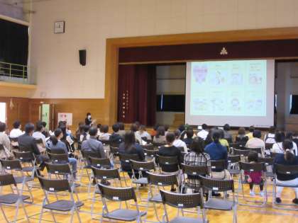 栄養教諭より、栄養バランスだけでなく、季節感や様々な食材に触れてもらうための工夫がつまった給食についての話を聞きました。人気のメニューのレシピも教えていただき、参加された保護者の方々は熱心に話を聞いておられました。