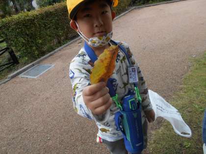 公園の中には、ドングリや色が変わった葉っぱがありました。子供たちは「みつけた!」「こっちにもあるよ!」と公園中を探し回りました。