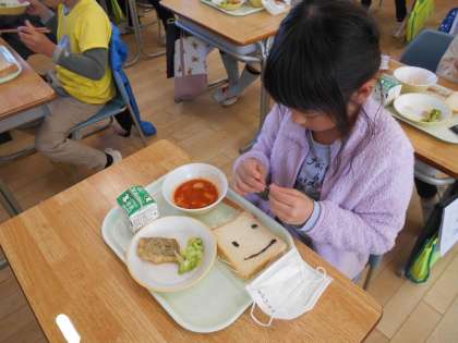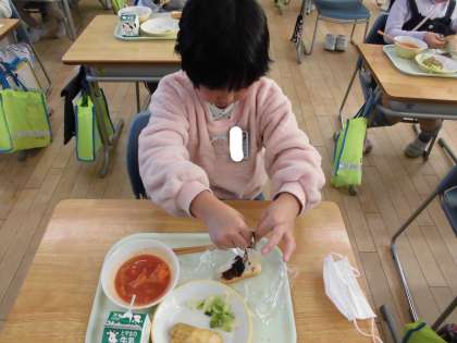 今日は、はじめてチョコレートクリームが出ました。献立を見ながら給食の時間を楽しみにしていました。クリームで絵を描いたり、たっぷりとのせたりして食べていました。