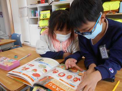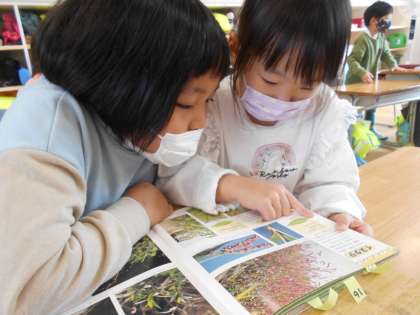 秋に関する本が図書室にあったので、みんなで順番に読みました。「この花、見たことあるよ」「いろんな色の葉っぱがあるんだね」「拾ったドングリでおもちゃを作ってみたいな」と秋への関心を高めました。
