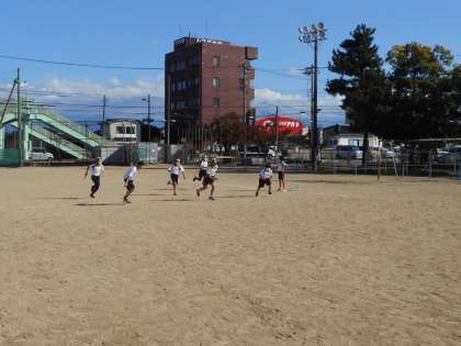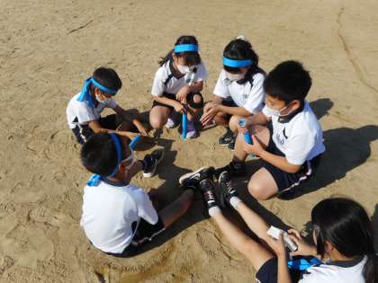 グラウンドで思いっきりバトンパスの練習をしました。少し時間が経つと、もっとバトンパスをよくするために、団で集まって作戦会議をする素敵な姿が見られました。