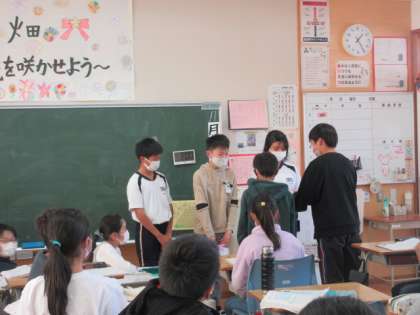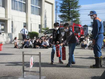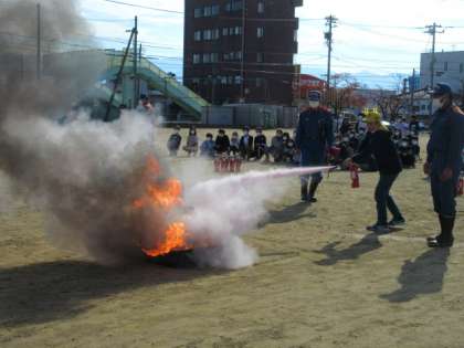 6年生の企画で、富山市消防署の方々をお招きして消火器で初期消火をしたり、煙の中を歩いたりする体験をしました。体験が終わった後には、企画をしてくれた6年生に、学んだことや感謝の気持ちを伝えました。