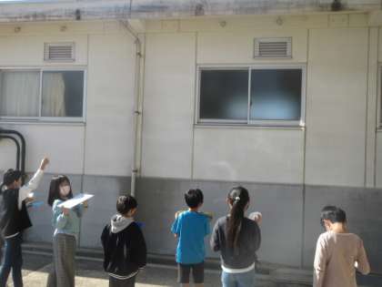 次の時間には、全員が鏡を持って実験をしました。「遠くまで反射した光が届いている。」「手に光を集めると温かいよ。」子供たちは夢中になって太陽の光の実験をしていました。