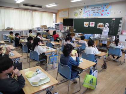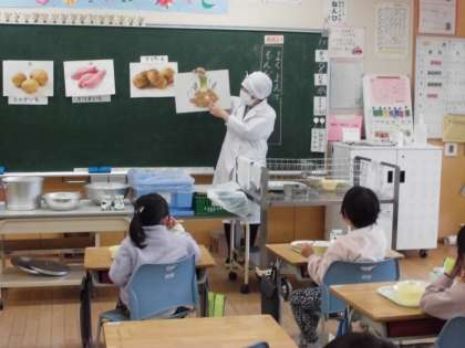 給食に里芋のコロッケがでました。里芋は芋の仲間で、ねばねばしていることや健康のためによいことを教えていただきました。今が旬の里芋は、おでんや豚汁にも入っていることを知りました。