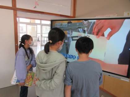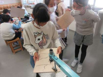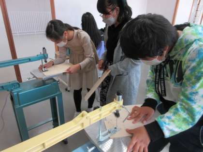 図画工作科の学習で、木の板からパズル等の作品をつくっています。電動糸のこぎりの使い方を確かめたいときは自由に動画で確認したり、友達と協力したりしながら、上手に板を切っています。