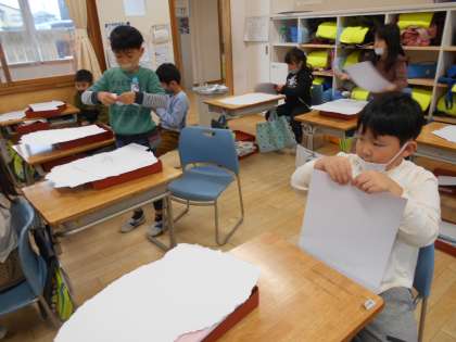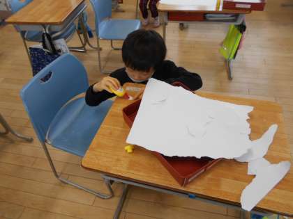 図工は、紙版画の準備をしました。白い画用紙を自由にちぎって貼り、「○○している自分の顔」をつくりました。「虫を捕まえようと真剣な自分の顔」「友達と鬼ごっこしている自分の顔」など、それぞれ想像を膨らませて、目や眉の向き、髪型などを考えました。