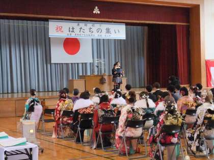 東部校区の「はたちの集い」が体育館で行われました。4年生の代表児童がお祝いの言葉を述べました。