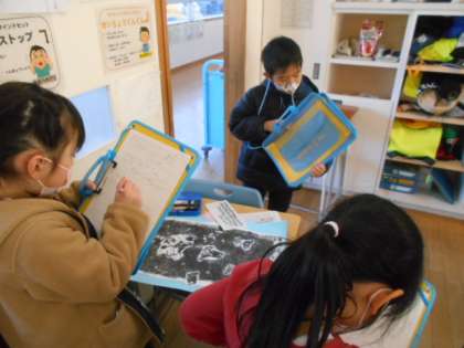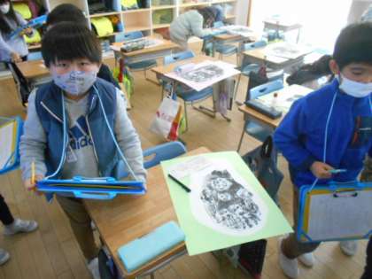 ○○しているぼく・わたしのようすを、画用紙をちぎって表した紙版画の鑑賞を行いました。友達のちぎった形やインクの付け方に注目したり、顔を刷る向きが面白いと感じたりしている様子でした。